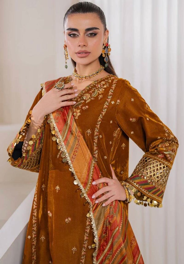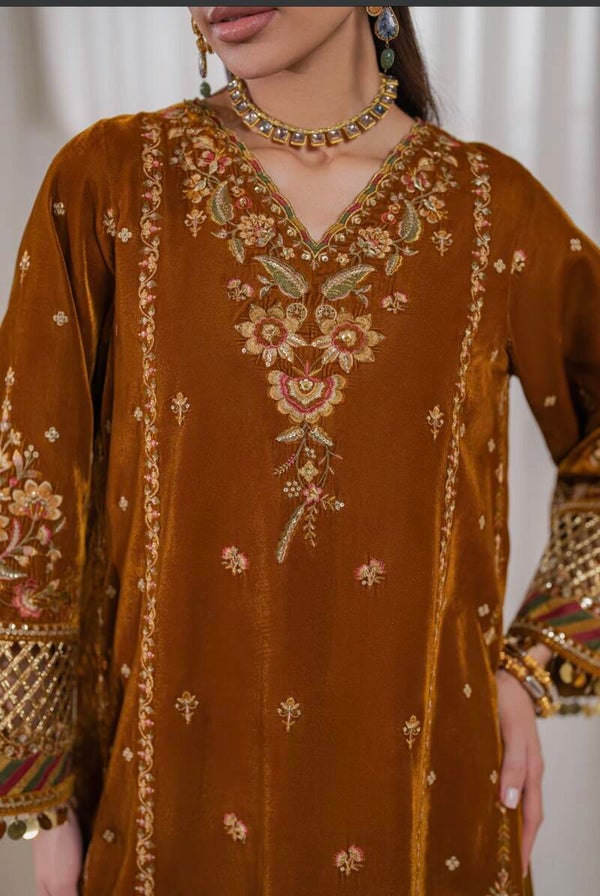 The outfit is a splendid display of meticulous detail work on a rich velvet fabric. The front and back panels are adorned with intricate embroidery, featuring golden threads and accents of jewel tones that complement the earthy brown backdrop. The sleeves are equally lavish, highlighted with matching embroidery and enhanced by additional organza borders that add depth and texture.