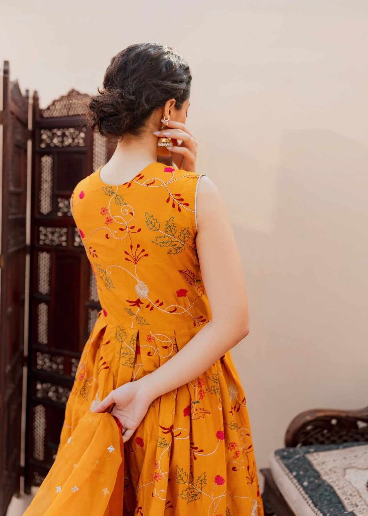 Embroidered lawn-cotton frock. Embroidered lawn-cotton gharara. Embroidered organza dupatta.