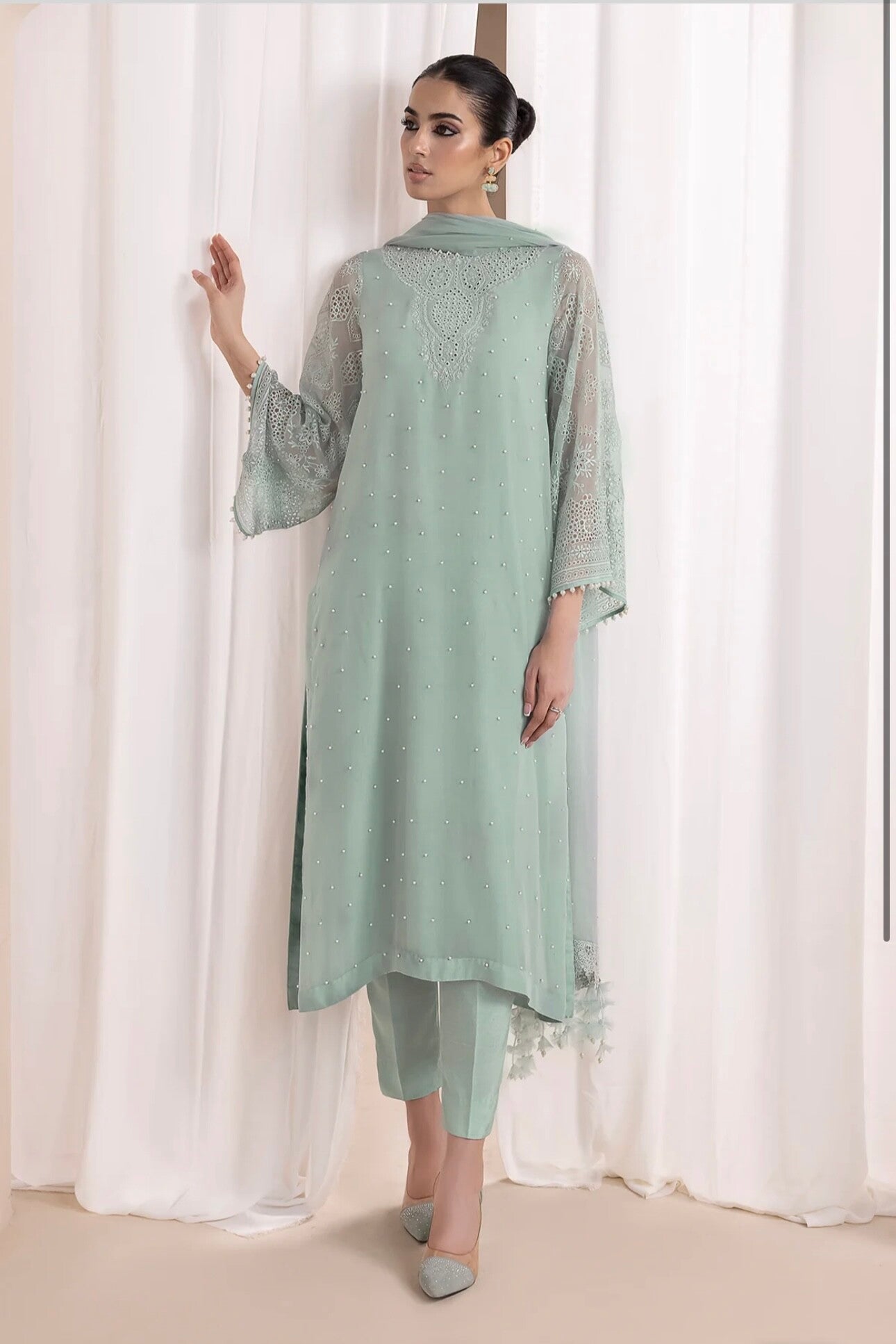 Shirt fabric : embroidered chiffonDupatta fabric : embroidered organzaTrouser fabric : gripIncludes : shirt, trouser and dupatta with accessories